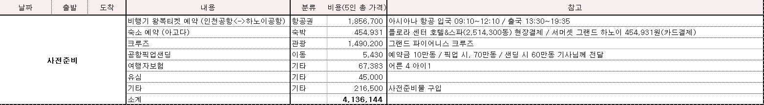 여행을 위한 사전 준비 금액으로 4,136,144원이 들었고