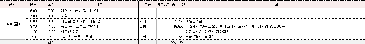 혹시나 제 일정과 경비를 참고하실 분들이 계실지 몰라 일정표를 첨부해 놓겠습니다.